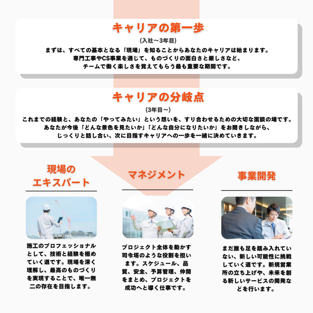 いきなりマルチタスクの施工管理を任されるのは不安ですが、まずは専門職から始めることができ、徐々にステップアップしていけます。